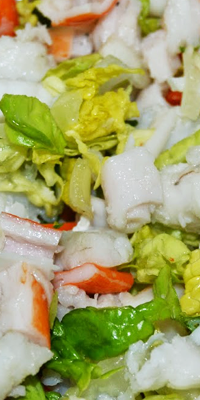 Ingredientes: 360 grs. de lechuga, 380 grs. netos de pescadilla, 25 grs. netos de aceitunas verdes, 120 grs. netos de palitos de mar, 130 grs. netos de pimientos morrones, 1 cucharada de ketchup, 60 grs. de yogur desnatado, 20 grs. netos de alcaparras y 70 grs. de mahonesa light.