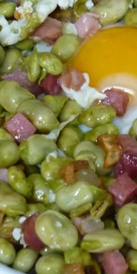 Ingredientes: 4 huevos, 800 grs. netos de habas frescas, 70 grs. netos de jamón serrano magro, 150 grs. netos de cebolla fresca, 160 grs. netos de pan de molde, 1 cucharada mediana de aceite de oliva, vinagre, sal y pimienta.