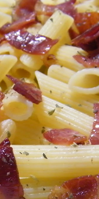 Ingredientes: 190 grs. netos de macarrones, 240 grs. netos de jamón serrano magro, 200 grs. netos de tomate, 40 grs. netos de queso parmesano rallado, 2 cucharadas de aceite, orégano, albahaca y sal.