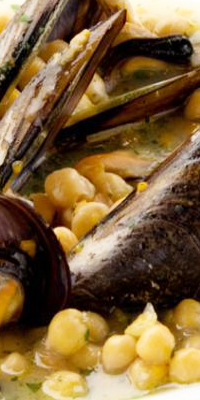 Preparación: Poner al fuego una perola con el aceite, cuando este caliente añadir la cebolla y el ajo picados y dejar pochar, sin que lleguen a dorarse. Agregar los garbanzos, el arroz, la sal y 1 vaso de agua. Dejar cocer hasta que el arroz este hecho (aproximadamente 15 minutos). Mientras tanto poner al fuego un cazo con agua, sal y un vaso de vino blanco y abrir los mejillones. Desprenderlos de las valvas, mezclarlos con los garbanzos y servir. También se pueden tomar aparte.