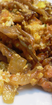 Ingredientes: 4 huevos, 350 grs. netos de setas, 110 grs. netos de colas de gamba, 1 cucharilla de aceite, 120 grs. netos de cebolla, 1 cucharada rasa de harina, perejil, sal, pimienta y nuez moscada.
