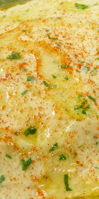 Preparación: poner en el vaso de la batidora los garbanzos, la tahina, el queso batido, la mitad del zumo de limón, el ajo y sal a gusto. Batir hasta formar un puré espeso. Preparar la ensalada picando en tiras muy finas la lechuga, el perejil, el tomate y la clara de huevo duro. Aliñar con el resto del zumo de limón y sal. Servir en un plato llano, extendiendo el hummus haciendo ondas con una cuchara y disponiendo la ensalada de manera sugerente. El hummus puede espolvorearse con pimentón dulce o comino.