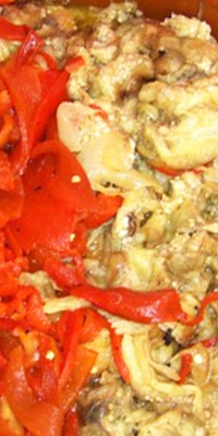 Preparación: se asan las verduras en el horno, se cortan en tiras y se salan. Se añade el bacalao desmigado y se aliña con el aceite de oliva.