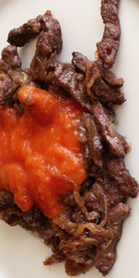 Ingredientes: 360 grs. de hígado de ternera, 2 cucharadas medianas de aceite de oliva, 3 dientes de ajo, 220 grs. de tomate, 1 cucharada de perejil y sal.