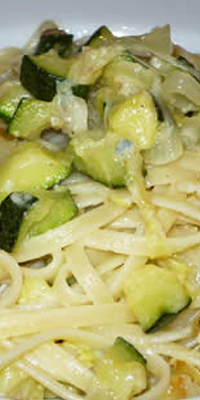 Ingredientes: 145 grs. de tallarines, 200 grs. netos de calabacine, 300 grs. netos de colas de gambas, 1 yogurt natural desnatado, 3 cucharadas medianas de aceite, 3 dientes de ajo, 25 grs. netos de almendra molida, sal y 40 grs. de zumo de limón.