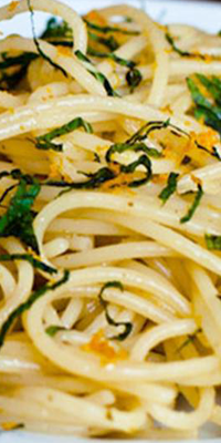 Ingredientes: 165 grs. de espaguetis, 4 dientes de ajo, 1 cucharada de aceite, 70 grs. netos de salchichas Frankfurt, 224 grs. netos de jamón serrano magro, 1 ramito de perejil, 6 hojas de menta fresca y sal.
