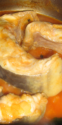 Preparación: Cortar el congrio en rodajas, cocerlo en agua y sal 15 minutos, escurrir y colocar en una fuente. Poner en una sartén el aceite y los dientes de ajo partidos en dos a lo largo. Antes de que se doren separar la sartén del fuego y añadir la harina, el pimentón, unas gotas de vinagre y 2 cucharadas del caldo de cocción. Poner la sartén al fuego otra vez durante 2 minutos para que la salsa de un hervor. Verter sobre el pescado y servir, acompañado de las patatas al vapor o asadas.