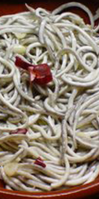 Ingredientes: 400 grs. netos de angulas, 4 dientes de ajo, 1 cucharada mediana de aceite 1 guindilla picante y sal. Añadir al plato el pan correspondiente.