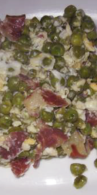 Preparación: Poner el aceite en una sartén. Echar el jamón cortado en trocitos finos. Cuando empiece a dorarse cascar los huevos encima, sazonar y remover sin parar a fuego lento para formar el revuelto. Antes de que cuaje, añadir los guisantes. Servir caliente. Acompañar este plato con el pan correspondiente a cada ración.
