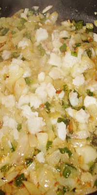 Preparación: Picar la cebolla, los pimientos y el tomate muy menuditos. Freir la cebolla, cuando esté a medio dorarse, incorporar los pimientos y por último el tomate. Dejar que se sofría hasta que esté en su punto. Agregar el bacalao desmigado y rehogarlo con las verduras. Por último, batir los huevos, mezclar con el sofrito, sazonar y cuajar la tortilla. Acompañar este plato con el pan correspondiente a cada ración.