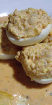 Preparación: Cocer los huevos hasta que estén duros. Pelar y partir por la mitad a lo largo. Mezclar las yemas, el aceite y el bacalao, hasta obtener una pasta, sazonar y rellenar los huevos. Colocarlos en una fuente de horno. Hacer una crema con la harina, la leche y el tomate y verterla por encima de los huevos. Meterlos en el horno 6 minutos y servir. Acompañar este plato con el pan correspondiente a cada ración.