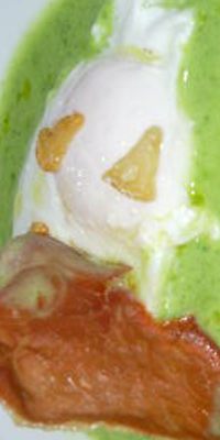 Preparación: Asar los pimientos, partirlos en tiras y colocarlos en una fuente. Escalfar los huevos ponerlos encima de los pimientos y adornar con el lomo. Acompañarlo del pan correspondiente a cada ración.