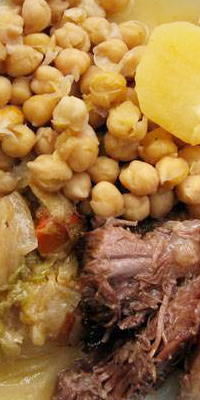 Preparación: Partir la carne y lavar y trocear las verduras. Poner agua a calentar. Cuando rompa a hervir, agregar todos los ingredientes y sazonar, dejar que dé varios hervores, espumar dos veces, tapar y dejar cocer a fuego lento unas 2 ó 2 1/2 horas (45 minutos en olla a presión). Dejar que se enfríe y desgrasar. Servir el caldo con los fideos y los garbanzos y la carne y las verduras aparte aliñadas con el aceite.