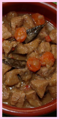Preparación: Poner en una fuente refractaria el aceite, la cebolla, los ajos y los pimientos picados. Trocear el cerdo, echarlo en la fuente sazonar, añadir laurel y rehogarlo lentamente hasta que comience a dorarse. Cubrir con agua y agregar las patatas partidas en tacos y las verduras, dejar hervir (20 minutos en olla a presión). Servir caliente. Acompañar este plato con el pan correspondiente a cada ración.