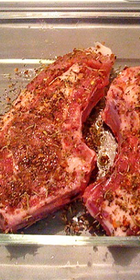 Ingredientes: 400 grs. netos de chuletas de cerdo, orégano, pimentón, sal, 3 cucharadas de aceite y 3 dientes de ajo.