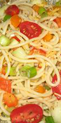 Ingredientes: 160 grs. de espaguetis, 280 grs. netos de carne de pollo sin grasa, 150 grs. de endibias, 80 grs. de zanahorias, 150 grs. de tomate, 30 grs. de aceitunas verdes sin hueso, 2 dientes de ajo, 30 grs de queso parmesano, 4 cucharadas medianas de aceite, vinagre, sal y pimienta.