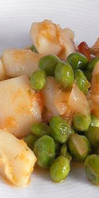 Preparación: Cortar la cebolla en aros finos y poner a dorar en una sartén con un poco de aceite y a fuego lento. Limpiar los cogollos y cortarlos en tiras; añadirlos junto con los guisantes a la cebolla y rehogar todo unos minutos. Salpimentar y pasar todo a una fuente. Hacer la sepia a la plancha, cortarla en cuadraditos e incorporarla al resto de ingredientes y servir.