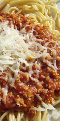 Ingredientes: 160 grs. de espaguetis, 320 grs. de ternera magra, 120 grs. de tomate, 30 grs. de cebolla fresca, 20 grs. de queso parmesano y 3 cucharadas de aceite de oliva.