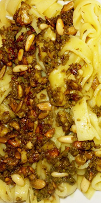 Preparación: Cocer la pasta en abundante agua y sal. Reservar. En un mortero, machacar los frutos secos hasta reducir a polvo. Mezclarlos con la leche y una pizca de pimienta, hasta conseguir una pasta uniforme. Reservar. En una sartén poner el aceite, hacer la sepia a la plancha, cortada en trocitos y los mejillones al vapor. Cuando los espaguetis estén "al dente", escurrirlos bien y echarlos en una fuente, junto con la sepia y los mejillones. Añadir el contenido del mortero, revolver bien con cuchara de palo, rociar con el queso rallado y servir muy caliente.