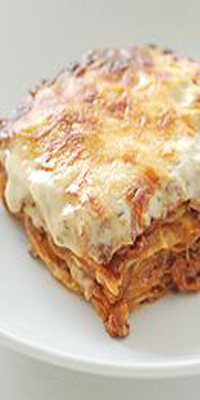 Ingredientes: 160 grs. de pasta para lasaña, 330 grs. netos de carne magra picada, 50 grs. netos de cebolla, 200 grs. de leche desnatada, 25 grs. netos de harina, 200 grs. netos de tomate, 20 grs. netos de queso parmesano rallado, 4 cucharadas de aceite de oliva, sal y orégano.