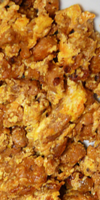 Ingredientes: 4 huevos, 180 grs. netos de pollo sin grasa, 240 grs. de tomate.