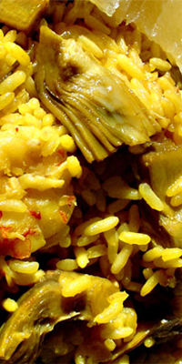 Ingredientes: 140 grs. de arroz, 360 grs. netos de conejo o pollo, 120 grs. netos de alcachofas, 100 grs. netos de habas tiernas, 2 dientes de ajo, 50 grs. netos de cebolla, 60 grs. netos de pimiento verde, 1 limón, 4 cucharadas de aceite de oliva y sal.