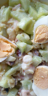 Ingredientes: 50 grs. de arroz Basmati, 300 grs. netos de pepino, 90 grs. netos de cebolla, 220 grs. netos de gambas peladas, 1 huevo duro, 15 grs. de nueces, 2 yogures de soja, media cucharadita de miel, curry en polvo.