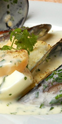 Preparación: Escalfar los huevos en agua hirviendo, recortar las claras para igualarlos. Lavar y cortar el clabacin en rodajas, ponerlo a pochar a fuego lento en una sarten antiadherente. Mientras tanto hervir los mejillones, dejarlos enfriar y quitarles las valvas. En una fuente de servir, colocar el calabacin, encima los huevos y alrededor los mejillones y servir. Acompañar este plato con el pan correspondiente a cada ración.