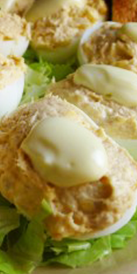 Preparación: Cocer los huevos, pelarlos y partirlos por la mitad a lo largo. Sacar las yemas. Mezclar con el tomate hasta formar una pasta consistente, Añadir el atún y rellenar los huevos con esta mezcla. Cubrirlos con la salsa hecha con la mahonesa y el yogur mezclados. Acompañar este plato con el pan correspondiente a cada ración.