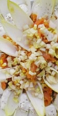 Preparación: Colocar las endibias separando las hojas de una en una, en una fuente redonda, de tal forma que parezca una flor. Ponerles sal, el ajo muy picadito repartido bien. Batir el aceite con el limón y un poquito de agua y ponerlo por encima bien distribuido. En el centro de la flor poner el jamón cortadito en virutas. Acompañar este plato con el pan correspondiente a cada ración.