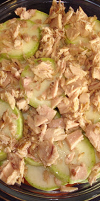 Ingredientes: 1 kg. neto de calabacín, 250 grs. netos de cebolla, 35 grs. netos de atún natural de lata, 1 cucharada mediana de aceite de oliva y sal.