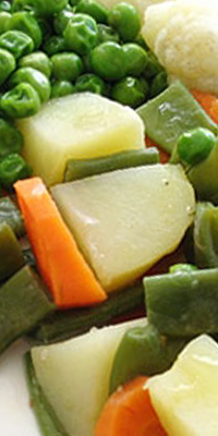 Ingredientes: 600 grs. netos de alcachofas, 300 grs. netos de cardo, 250 grs. netos de judias verdes, 150 grs. netos de zanahoria, 80 grs. netos de guisantes, 150 grs. netos de champiñones, 200 grs. netos de espárragos, 150 grs. netos de cebolla, 160 grs. de jamón serrano magro, 2 cucharadas de aceite de oliva, 1 vasito de vino blanco, sal y pimienta.