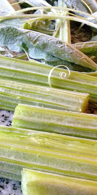 Ingredientes: 1.200 grs. netos de cardo fresco, 200 grs. netos de fiambre de pavo, 90 grs. netos de cebolla, 3 dientes de ajo, 2 cucharadas de harina, 3 cucharadas medianas de aceite, sal y un vasito de vino blanco.