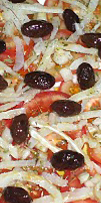 Ingredientes: 300 grs. netos de tomate, 120 grs. netos de cebolla tierna, 400 grs. netos de patatas, 180 grs. netos de bacalao desalado, 25 grs. de aceitunas verdes sin hueso, 100 grs. de pimiento rojo y 2 cucharadas medianas de aceite. y sal.
