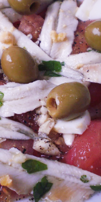 Ingredientes: 400 grs. netos de escarola, 300 grs. netos de tomate, 200 grs. netos de boquerones en vinagre, 100 grs. netos de remolacha, 3 dientes de ajo, 1 cucharada mediana de aceite de oliva, 100 grs. de pan integral, vinagre y sal.