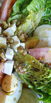 Ingredientes: 500 grs. netos de cogollos de lechuga, 45 grs. netos de anchoas de lata bien escurridas, 90 grs. netos de gambas, 1 cucharada de aceite de oliva, 30 cc. de zumo de limón, 3 dientes de ajo, 100 grs. de pan integal y sal.