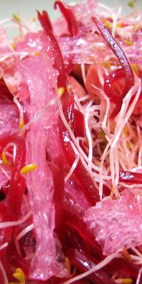 Preparación: En una ensaladera trocear la remolacha en lonchas y la lechuga en tiritas, Agregar las gambas. Añadir a la mahonesa el zumo de limón, el yogurt, un poco de caldo de la remolacha, la cebolla rallada, pimienta y sal. Verter sobre la ensalda y dejar macerar en el frigorífico un rato antes de servir.