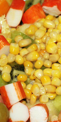 Ingredientes: 400 grs. netos de lechuga, 150 grs. netos de maiz cocido, 105 grs. netos de cebolla, 90 grs. netos de palitos de mar, 65 grs. netos de colas de gamba, 12 cc. de aceite de oliva, vinagre y sal.