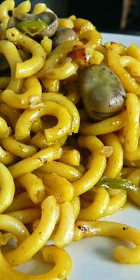 Ingredientes: 500 grs. netos de habas frescas, 110 grs. netos de tallarines, 100 grs. netos de jamón serrano magro, 100 grs. netos de tomate, 54 grs. netos de queso parmesano rallado, 2 dientes de ajo, 2 cucharadas medianas de aceite de oliva, pimienta y sal.
