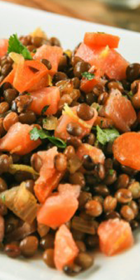 Preparación: En una fuente colocar las lentejas y mezclarlas con el puerro partido en juliana. Hacer una salsa con el aceite y el vinagre batidos y mezclar con las lentejas. Partir el salmón en rodajas finas, hacerlo a la plancha y colocarlo sobre las lentejas. Acompañar con el pan correspondiente a cada ración