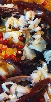 Ingredientes: 900 grs. netos de remolacha cocida, 180 grs. netos de cebolla fresca, 160 grs. netos de pimiento verde, 200 grs. netos de bacalao desalado, 3 dientes de ajo, 2 cucharadas de aceite de oliva, vinagre y sal.