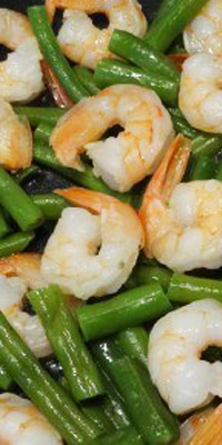Preparación: Picar el ajo y dorarlo en una sartén con el aceite. Cuando comience a tomar color, retirar del fuego y añadir el pimentón y reservar. Limpiar y cocer las judías. Escurrirlas, sazonarlas y rehogarlas en la misma sartén con los ajos y las gambas 8 minutos. Servir calientes.