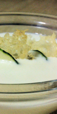 Preparación: pelar y picar muy menudo, en una fuente, el pepino, los ajos, el calabacín y la cebolla. Verter encima el zumo del limón y el aceite, y dejar macerar por lo menos media hora. Mientras tanto, hacer las colas de gamba a la plancha, dejar enfriar y picarlas menuditas. Añadir los yogures batidos, encima del macerado, remover, agregar las gambas y comprobar la sal. Servir fría, en boles, con el perejil picado espolvoreado por encima.