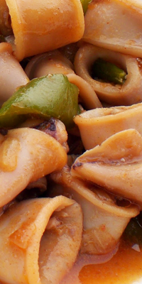 Preparación: limpiar los calamares y trocearlos. Rehogarlos en una cazuela con el aceite y el ajo. Cuando estén dorados añadir la harina, la sal, la pimienta, el vinagre y el coñac flameado. Dejar cocer despacio, hasta que estén tiernos. Si fuera necesario, añadir agua. Acompañar este plato con el pan correspondiente a cada ración.