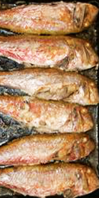 Preparación: Limpiar y sazonar los salmonetes. Picar los ajos muy menudos e introducir algun trocito en el interior de cada salmonete. Tapar una bandeja de horno con papel de aluminio, rociarla con el aceite y colocar los salmonetes encima. Meter a horno medio, hasta que se doren. A media cocción echar el zumo de limón por encima. Acompañar este plato con el pan correspondiente a cada ración.