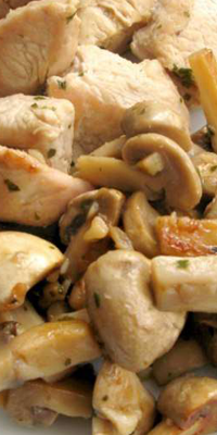 Ingredientes: 355 grs. netos de pollo sin piel, 380 grs. netos de champiñones, 1 copita de jerez seco, 12 grs. netos de harina, pimienta, tomillo, laurel y sal. Rociar/pulverizar ligeramente con aceite de oliva en espray.