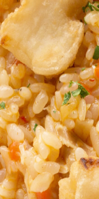 Ingredientes: 165 grs. netos de arroz, 340 grs. netos de bacalao desmigado y desalado, 100 grs. netos de tomate natural triturado, 60 grs. netos de pimiento verde, 60 grs. netos de pimiento rojo, 50 grs. netos de cebolla, 4 dientes de ajo, 8 grs. de perejil, azafrán, y sal. Rociar/pulverizar ligeramente con aceite de oliva en espray.