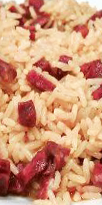Preparación: Poner al fuego una perola con agua y sal y cuando rompa a hervir echar el arroz, dejar 20 minutos, escurrir y reservar. Poner en una sartén el aceite. Freir la cebolla rallada y el ajo picadito. A los 3 minutos, añadir el jamón cortado en trocitos, dar unas vueltas y dejar 5 minutos. Poner el arroz en una fuente ovalada, aplanándolo con una cuchara de palo. Verter el contenido de la sartén y servir caliente.
