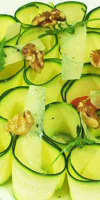 Ingredientes: 400 grs. de calabacín pelado y sin pepitas, 30 grs. de tomates desecados, 35 grs. de queso parmesano en lascas, 10 grs. de nueces peladas cortadas en trozos, 20 grs. de zumo de limón, 6 grs. de aceite de oliva, 40 grs. de pan tostado, sal, pimienta negra. Preparación: pelar los calabacines y con el mismo pelador, cortarlos en tiras largas y muy finas. Salar a gusto y aliñar con el zumo de limón. Añadir los tomates desecados, previamente remojados durante al menos media hora en agua, cortados en trocitos. Agregar también los trozos de nueces. Condimentar con un toque de pimienta y con el aceite. Por último, distribuir las lascas de parmesano por encima y servir acompañado del pan tostado.