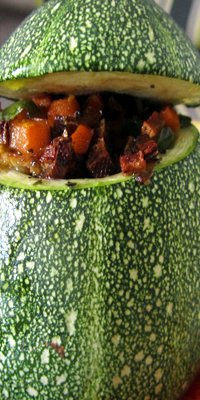 Elaboración: cortar los calabacines con piel por la mitad longitudinálmente y cocerlos unos 15 minutos en agua con sal o asarlos en el microondas tapados. Cuando estén blandos, vaciar la pulpa con una cucharilla. Cocer las patatas peladas y troceadas en agua o en el microondas. Hacer un puré con las patatas el huevo batido, el queso rallado y la pulpa de los calabacines, y salpimentarlo. Picar el ajo y cortar el jamón en taquitos pequeños, y dorar en una sartén con el aceite. Agregarlo al puré. Rellenar la corteza de los calabacines y gratinar al horno. Servir decorado con los tomates cherry y el perejil espolvoreado.